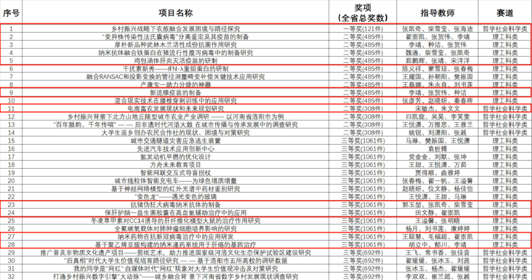 近日,由共青团河南省委、河南省教育厅、河南省社会科学院、河南省科学技术协会、河南省学生联合会共同主办的第十六届“挑战杯”河南省大学生课外学术科技作品竞赛获奖名单发布,我院荣获一等奖1项、二等奖6项、三等奖4项,获奖作品数量再创新高。