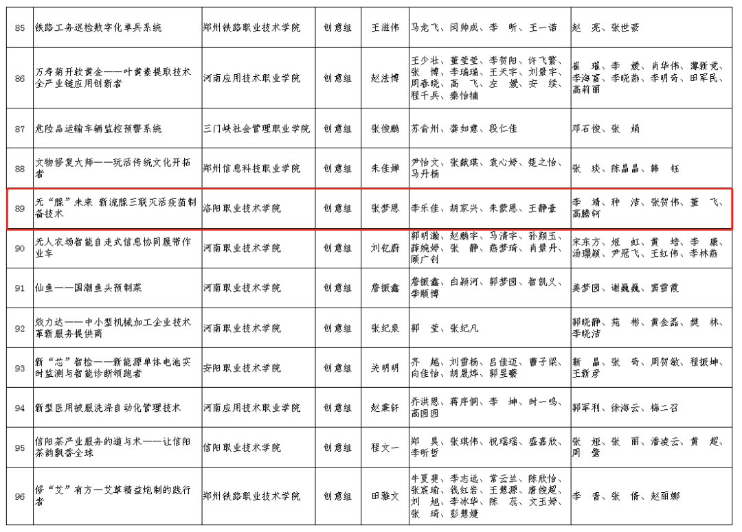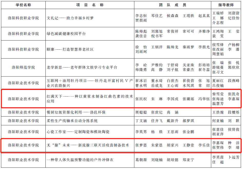 此外,河南省教育厅发布《关于公布2022年河南省“互联网+”大学生创新创业大赛暨第八届中国国际“互联网+”大学生创新创业大赛河南赛区选拔赛获奖名单的通知》,我院参赛项目《无“腺”未来-新流腺三联灭活疫苗制备技术》在大赛中荣获职教赛道二等奖,《“碎米成金”——特色红曲霉菌助力乡村振兴》荣获青年红色筑梦之旅赛道三等奖。
