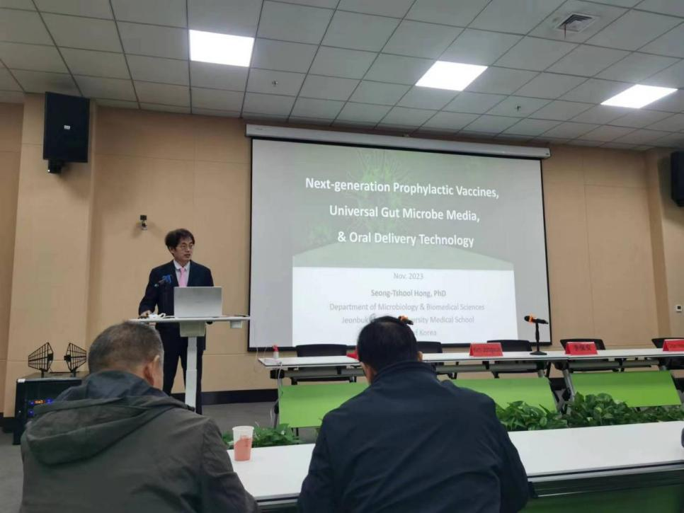 Hong Seongtshool教授以《下一代预防性疫苗、通用肠道微生物培养基和口服给药技术》为题,围绕COVID-19肠道微生物疫苗、流感病毒肠道微生物疫苗、肠道微生物通用培养基、SFTS的mRNA疫苗、口服给药平台QUOD等方面展开讲解。Hong教授表示会继续深入科研合作交流和共建国际联合实验室。随后,部分与会人员和Hong Seongtshool教授就科研中遇到的疑难问题进行了深入交流。