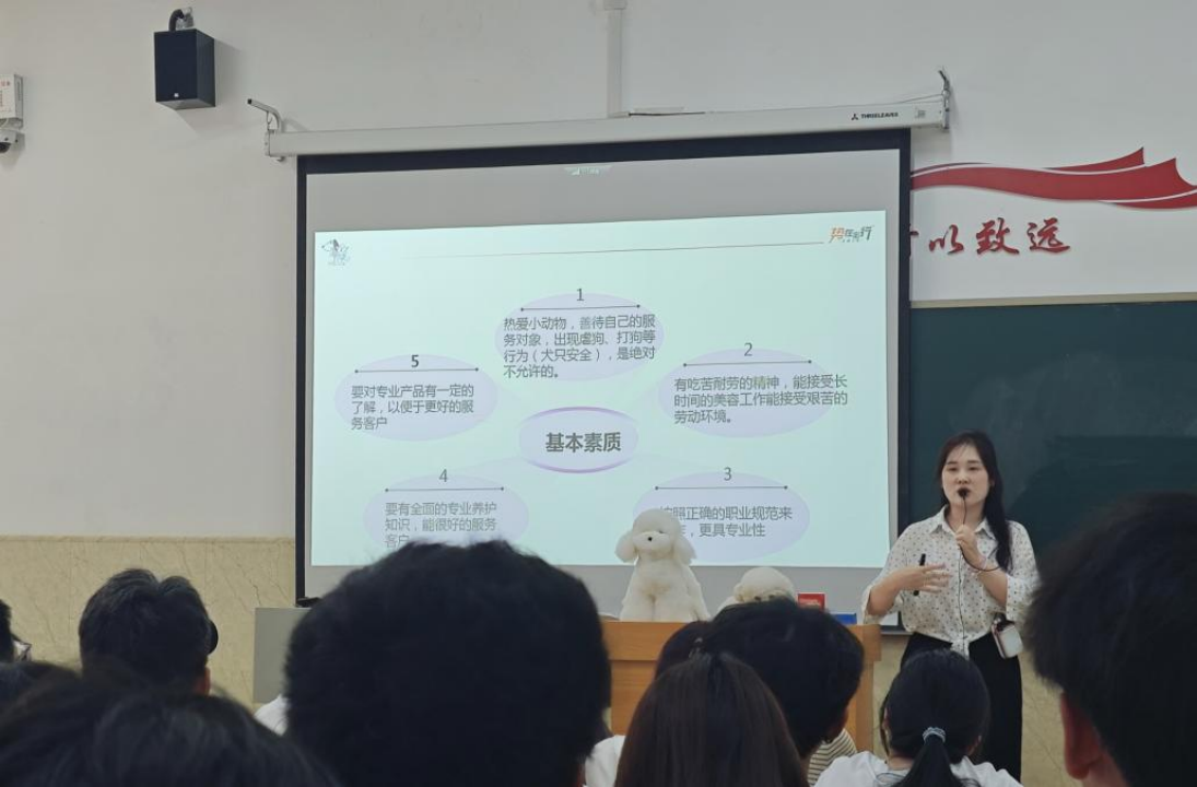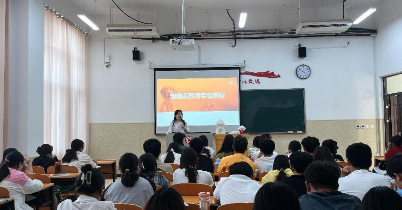 讲座伊始,派多格宠物学院的高张伟老师通过生动的案例和丰富的实践经验,向学生们详细介绍了宠物美容行业的发展趋势、市场需求以及职业前景。高张伟还分享了宠物美容师的工作内容、技能要求以及行业规范,使学生们对宠物美容师这一职业有了更为全面地认识。在互动环节,学生们积极与老师进行交流沟通,现场气氛活跃轻松。