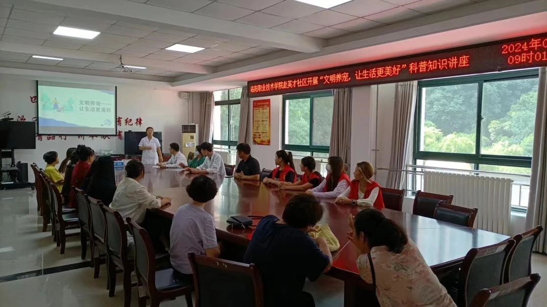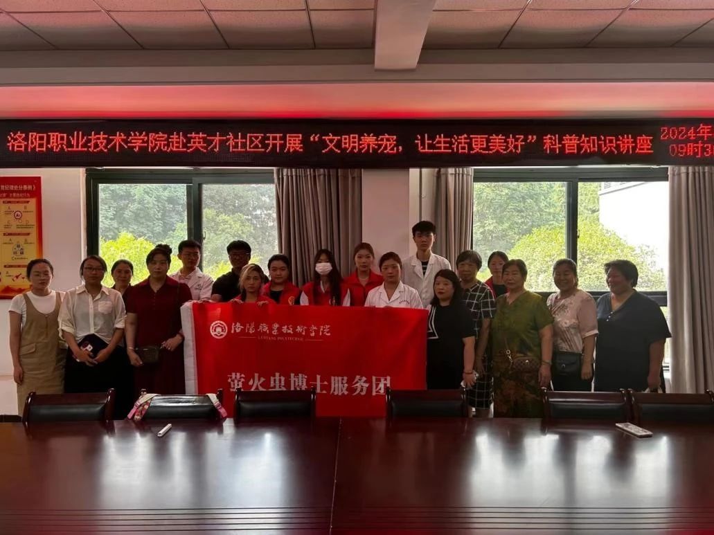 为发挥职业院校服务地方、服务群众的职能,充分展示学院改革发展成就和教书育人成果,普及文明养宠、科学养宠知识,提升学院师生的实践动手能力,7月2日,食品与药品学院“萤火虫博士服务团”联合洛职爱宠联盟社团、洛阳关爱动物医院在英才社区开展了“文明养宠,让生活更美好”科普知识讲座活动。