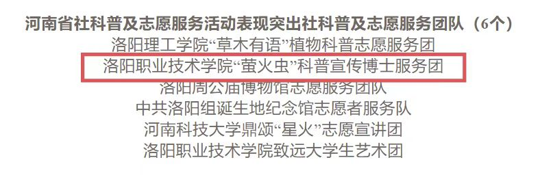 近期,河南省社科联公布关于2024年社科普及活动中表现突出单位、个人和特色活动的通报,其中我院“萤火虫”博士服务团荣获“河南省社科普及志愿服务活动表现突出社科普及志愿服务团队”称号。